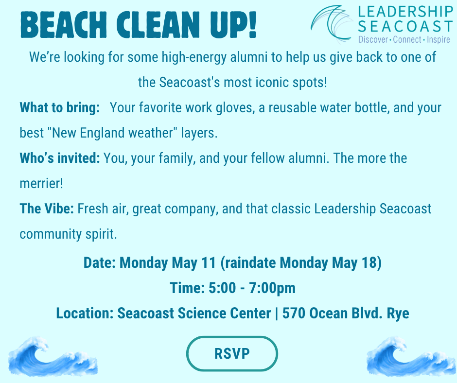 Wednesday, June 11, 2025 Atlantic Grill5 Pioneer RdRye, NH5:30-7:30pm Celebrate the Class of 2025! Join us at the Atlantic Grill to celebrate the Leadership Seacoast Class …